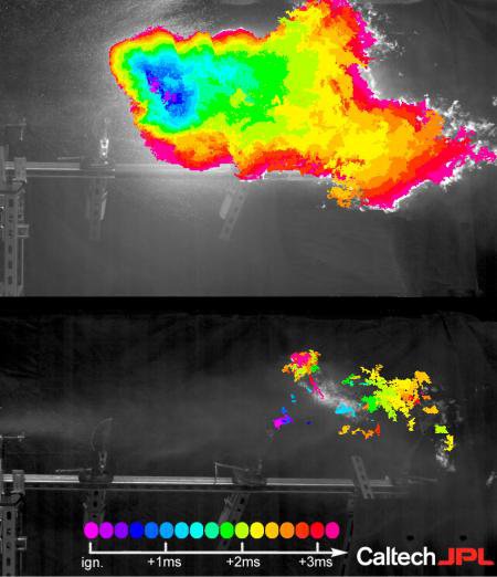 The progress of the flame after ignition in a post-impact mist of Jet-A fuel treated with prior ultra-long polymers (upper) and the Caltech polymer (lower) after the samples have passed through a fuel pump 50 times. The efficacy of prior polymers is lost, and a large, hot fireball ensues. The Caltech polymer retains its ability to mitigate post-impact fire. The color scale shows the progression of the flame with time.